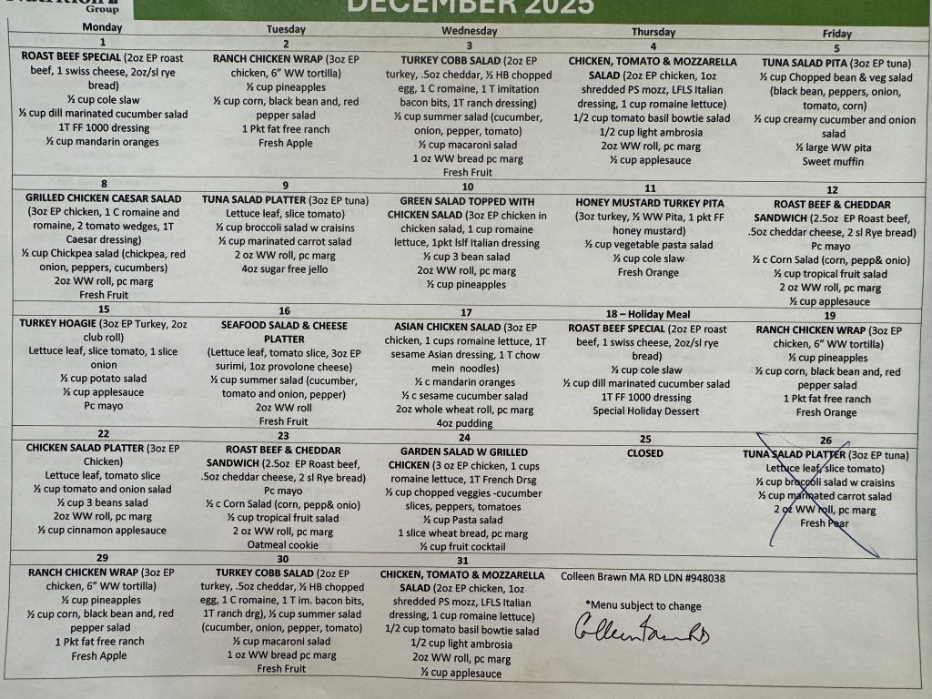 December 2025 Cold Lunch Menu