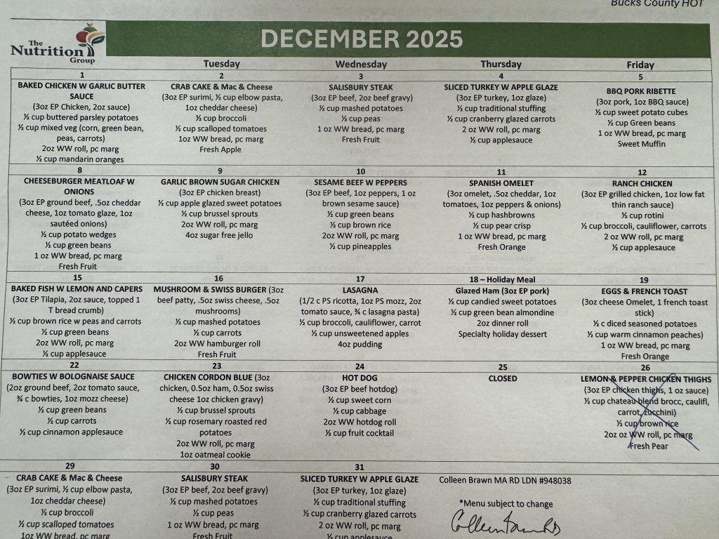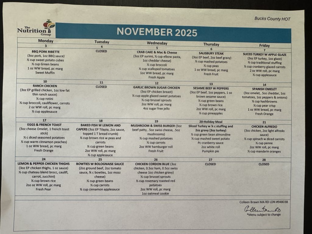 Lunch provided through the Bucks County Area Agency on Aging is served at 12:00 Noon Mon-Thur. & 11:30 AM Friday.